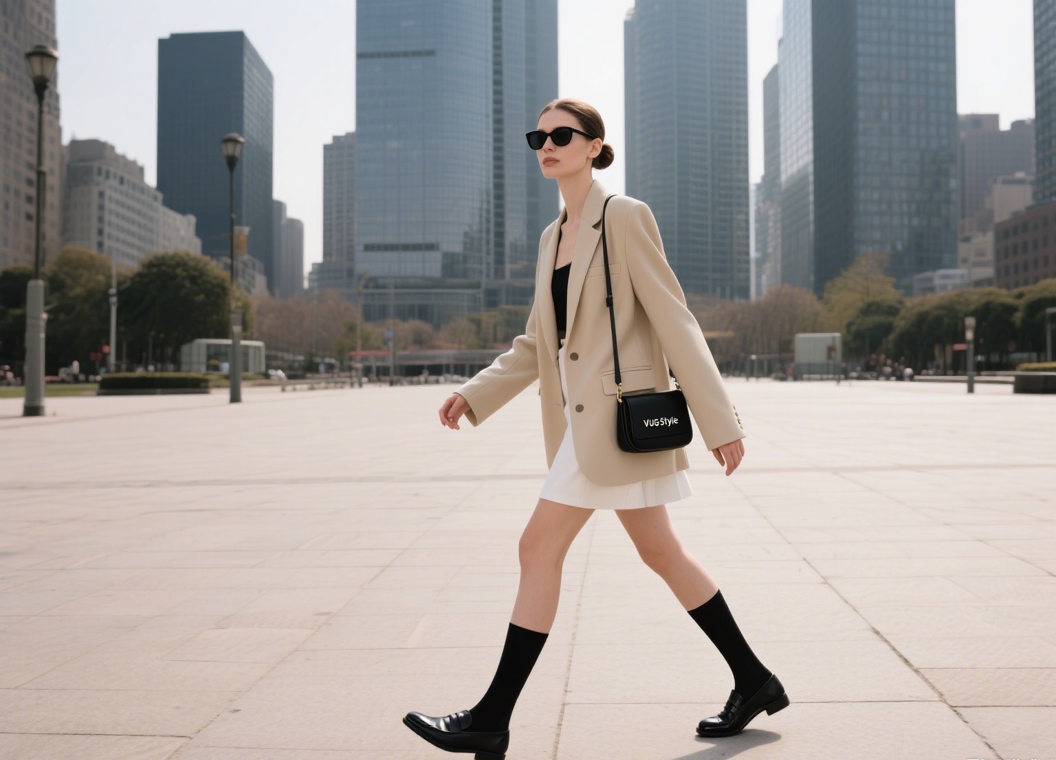 Choose black leather loafers from Vug.style and pair them with a beige oversized suit for a corporate-cool look. For a casual twist, wear them with Bermuda shorts and a white tee, adding white socks for Hailey’s academia-inspired vibe. A structured tote or crossbody bag completes the ensemble.