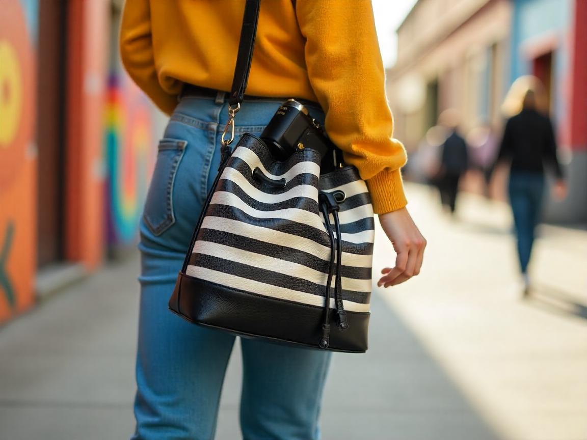 Styling Tip: Choose a bucket bag with a bold pattern, like stripes or animal print, to add personality to a monochromatic outfit.
